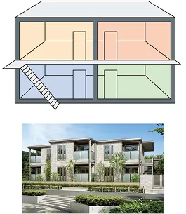 中階段から各世帯へアクセス。プライバシーを確保しつつ、効率のよい室内レイアウトにより、ゆとりあるプランが実感でき、ファミリーやカップルに最適です。