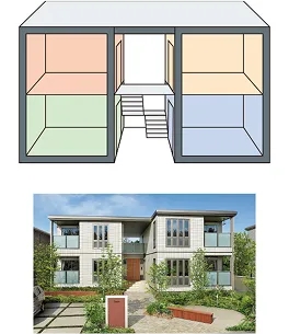 片側に廊下を設ける住戸形式で、効率の良い住戸配置が可能です。ファミリー、カップルからシングルまで、異なるプランの組み合わせも対応します。