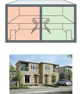 全世帯の玄関を1階に設け、2階世帯へは屋内階段でアクセス。屋外の教養部を削減できるため、敷地を有効に活用できます。