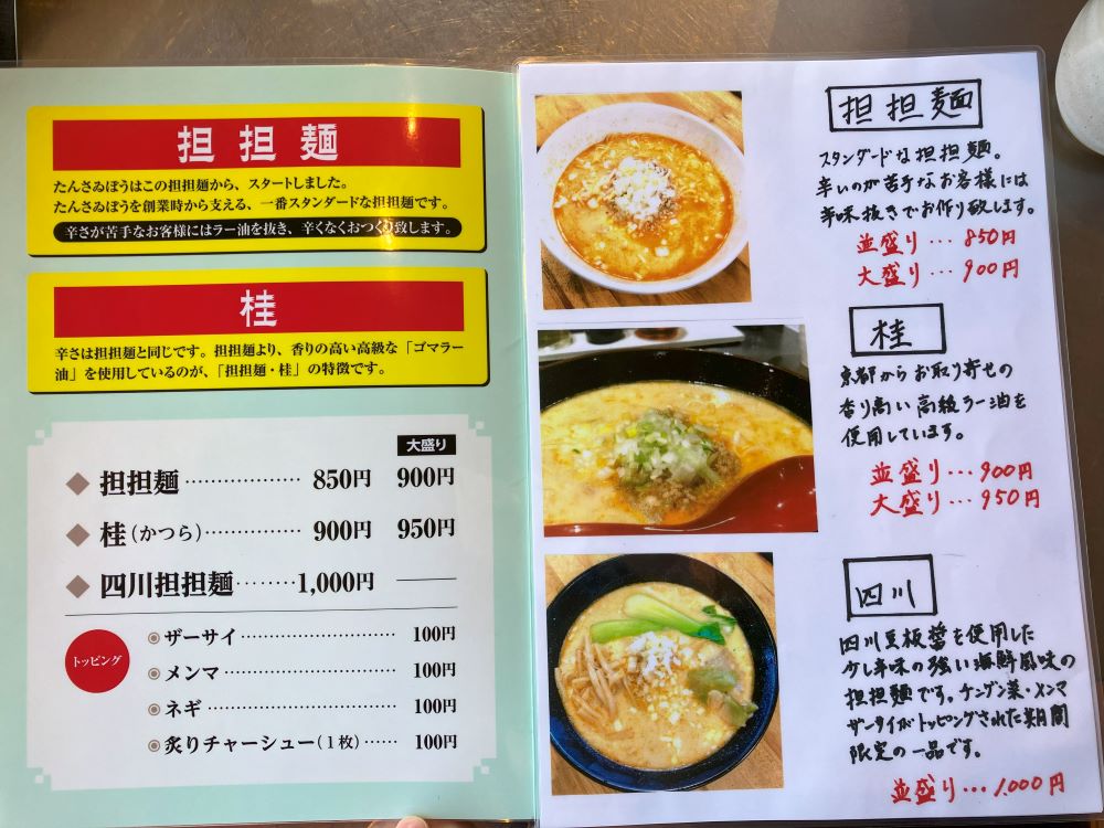 オーソドックスな「担担麺」、香り高い高級なゴマラー油を使用した「桂」、期間限定の四川豆板醤を使用した「四川」がありました。
