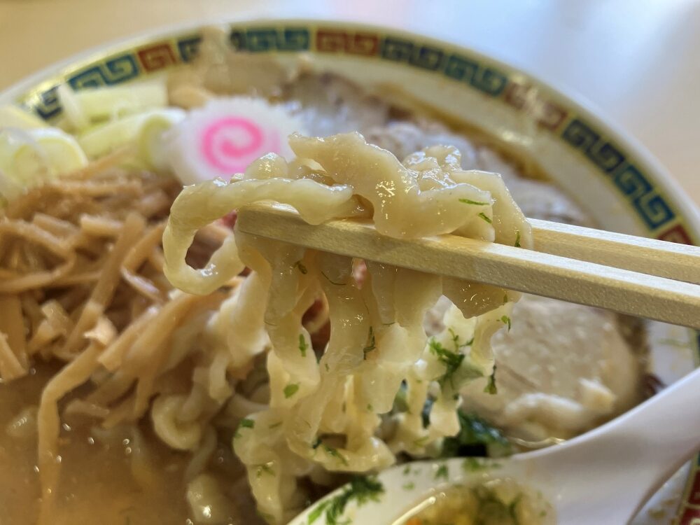県産小麦を配合した国産100%の小麦粉を使用し、生地を丁寧に熟成。手揉みで仕上げているそう。スープがよく絡み、もちもちとした食感と小麦の香りが楽しめるとのこと。