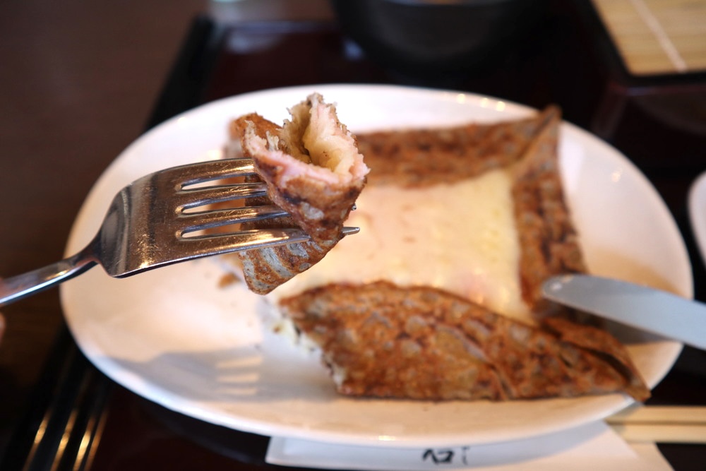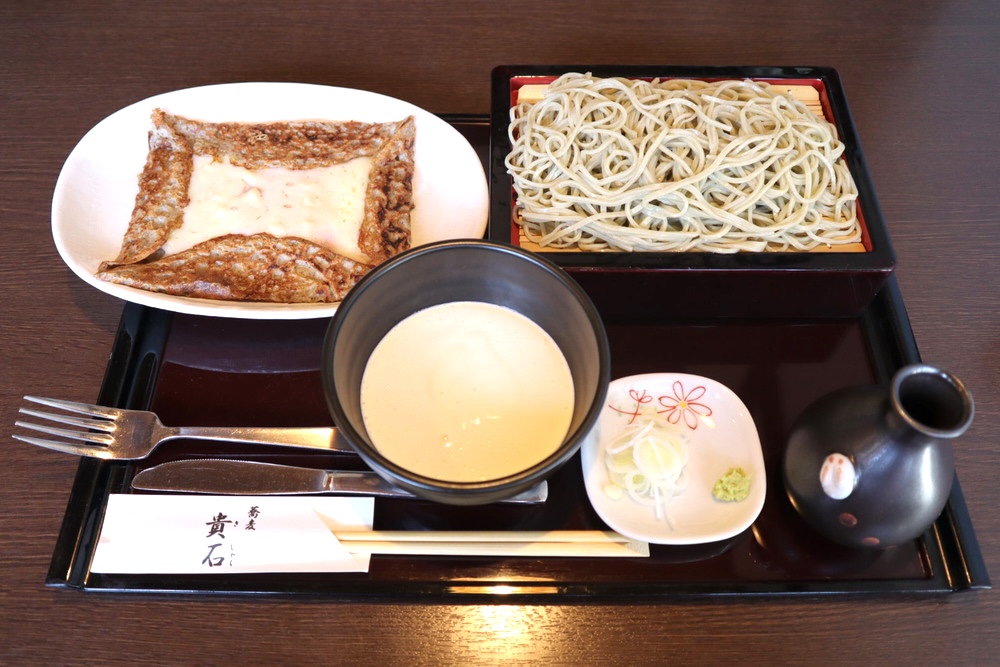 届いたおぼんには、蕎麦の隣にガレット、箸の横にはフォークとナイフ。