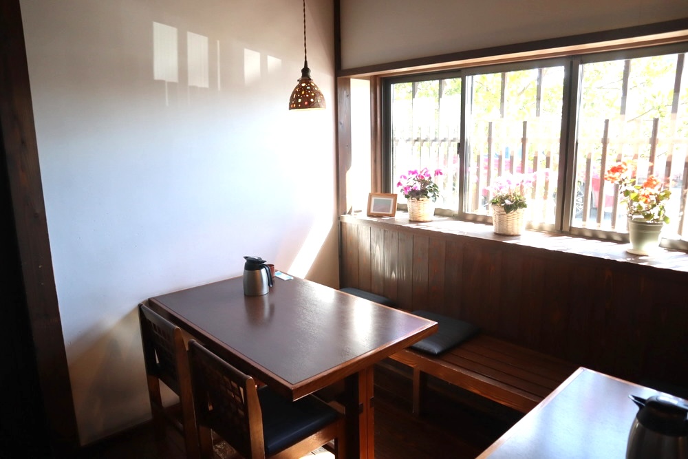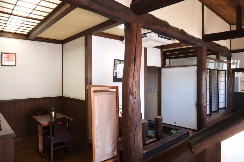 店内は、白い壁とこげ茶色の柱や梁が印象的な古民家で、和のあたたかみと落ち着いた空間が広がっています。