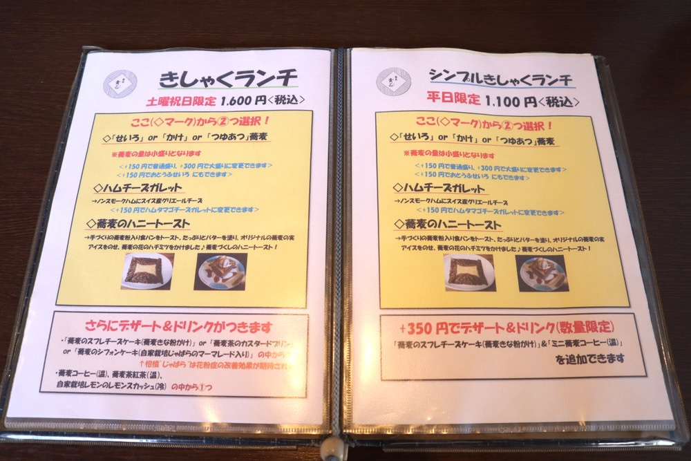 メニューは、平日限定のシンプルきしゃくランチ(1100円)と土日祝日限定のきしゃくランチ(1600円)。