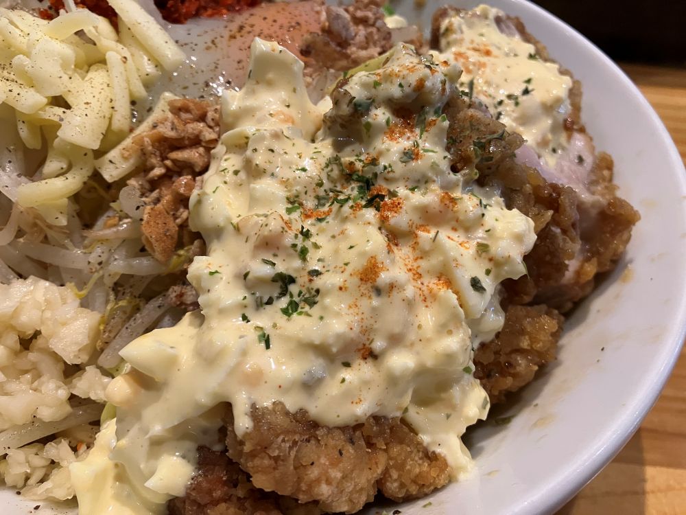 その理由は、こちらの「鶏竜田揚げ タルタルソースかけ」がのっていることです。サックサクの衣がついたジューシーな竜田揚げに甘めのタルタルソースが良く合います!