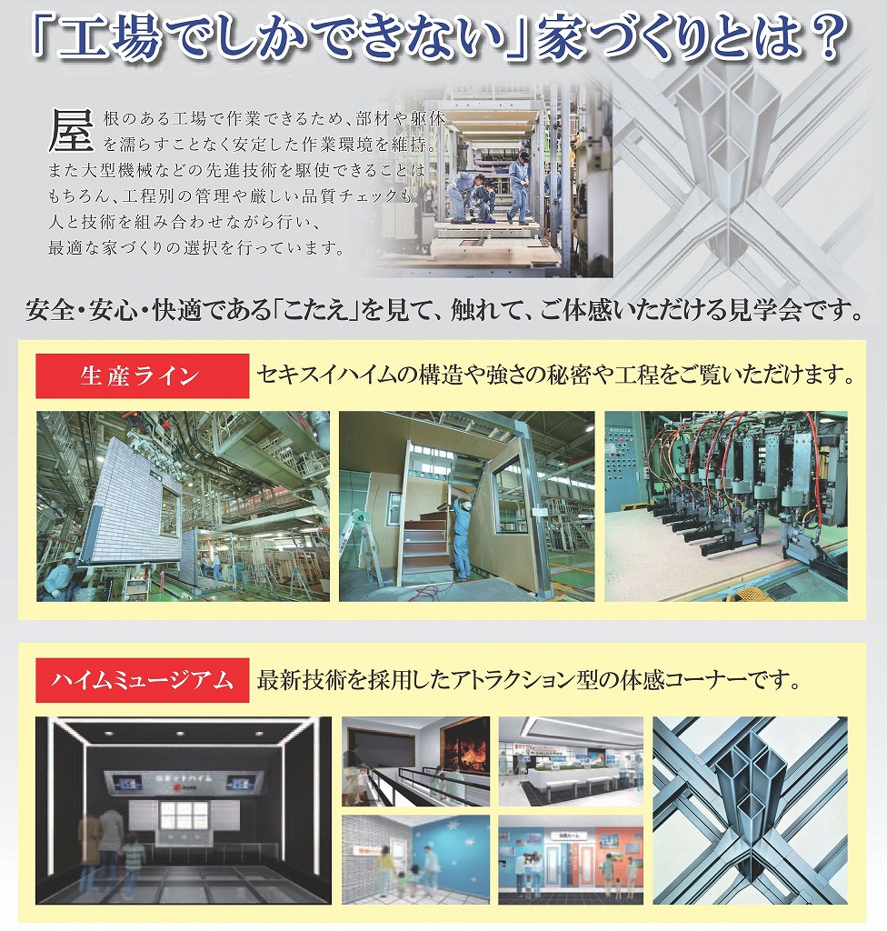 完全予約制となります 『長く快適に暮らしていただきたい』だから、セキスイハイムの住まいは“屋根の下”でたいせつにつくります。 工場生産のメリットを活かし、設計値どおりの性能を一邸一邸にお届けする、その様子をじっくりご確認いただけます。