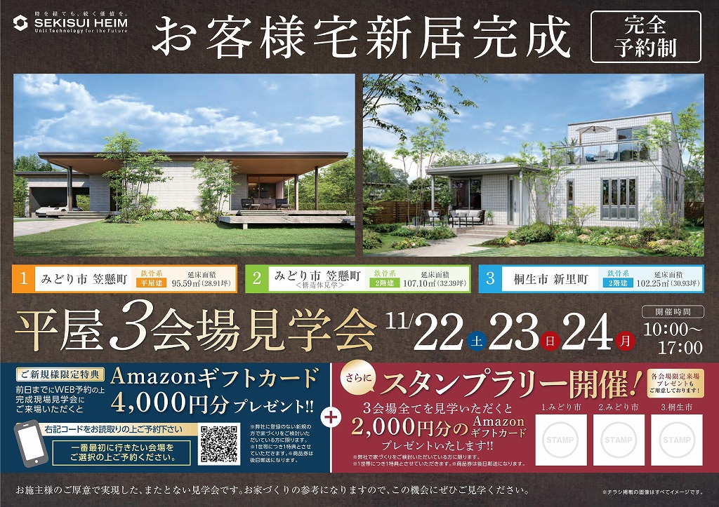 完全予約制にてご案内いたします 人気の平屋を3棟ご見学いただけます!