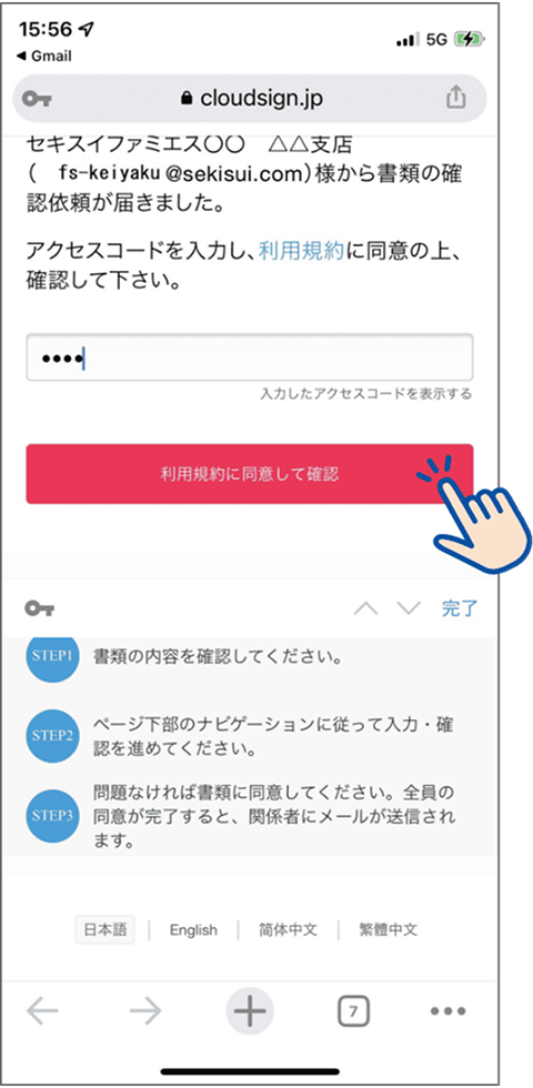 アクセスコードを入力して、「利用規約に同意して確認」を押してください。
