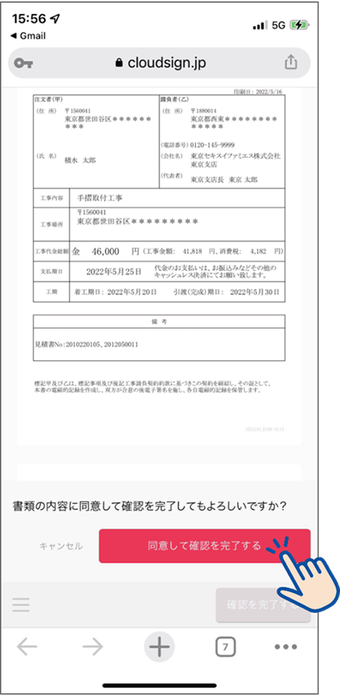 いただきますクラウドサインから届いたメールのリンクを押して、ご契約時と同様に『アクセスコード』を入力して完了書をご確認の上、「同意して確認を完了する」ボタンを押して頂くと工事完了の手続が完了します。