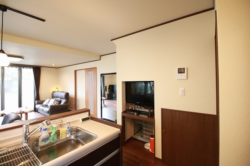 リビングが見渡せるオープンキッチンの横に、階段下の空間を利用してワンちゃんのゲージが入れられる棚を造作しました。その上にはお料理中の奥様専用のテレビも設置。キッチンに立つ時間がより有意義なものになりました。