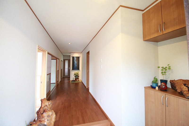 中に入ると目に飛び込んでくるのが開放的な玄関ホール。階段上に設けたトップライトのおかげで、日中は自然光が広がり照明がなくても明るい空間になりました。