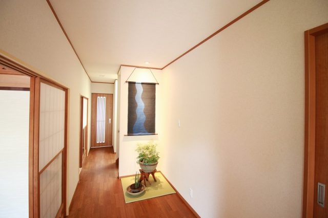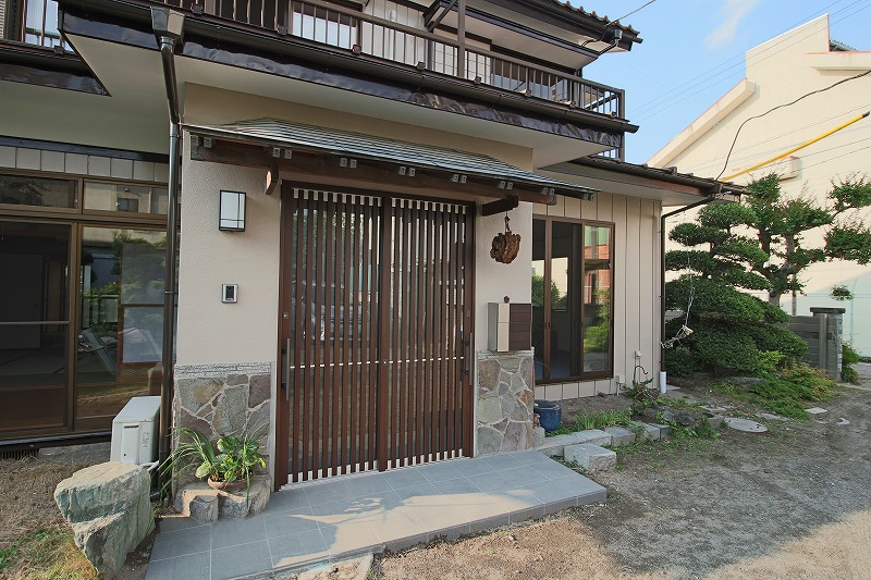 美しい格子の引き戸が、趣のあるエントランスを演出しています。玄関脇には植物がしつらえられ、奥様のおもてなしの心が伝わってきます。