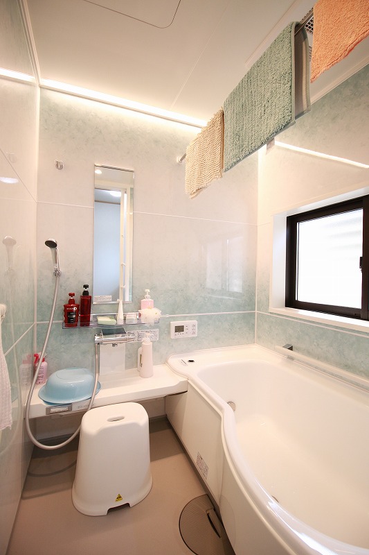 毎日のお風呂の時間を楽しむため、安全性や機能性の高い設備を選びました。清潔感のある明るい色合いや、天井に沿ったライン上の照明が奥様のお気に入りです。