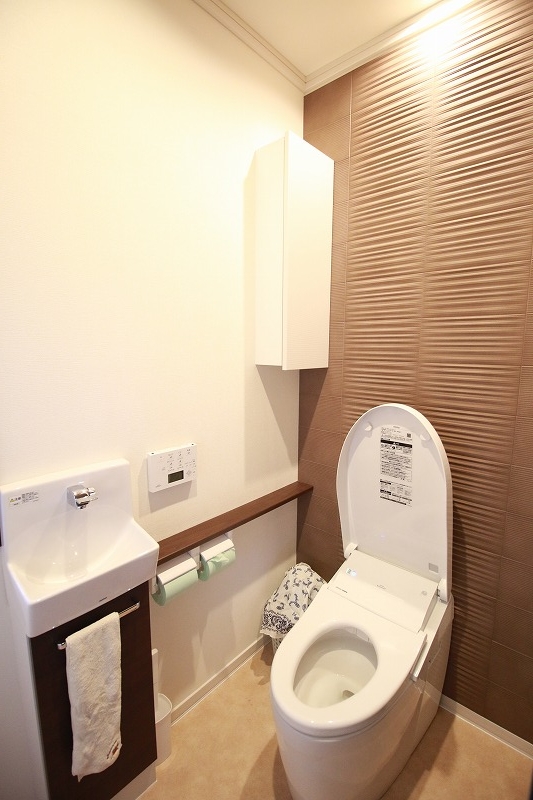 タンクレストイレにすることで、トイレ空間が広くなりました。背面の壁に貼ったエコカラットは、デザイン性だけでなく空気もキレイにしてくれます!