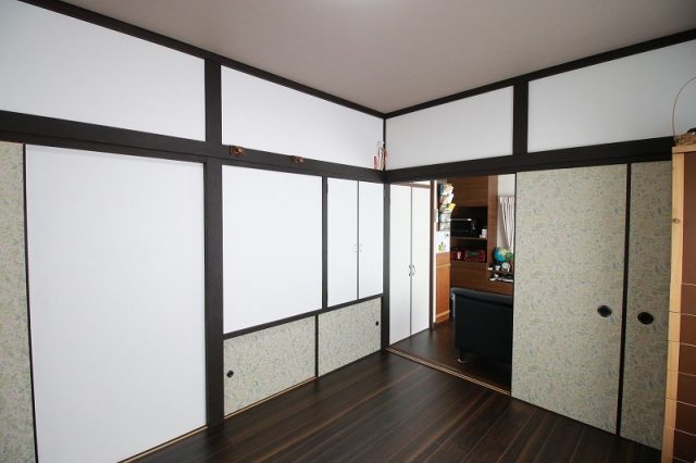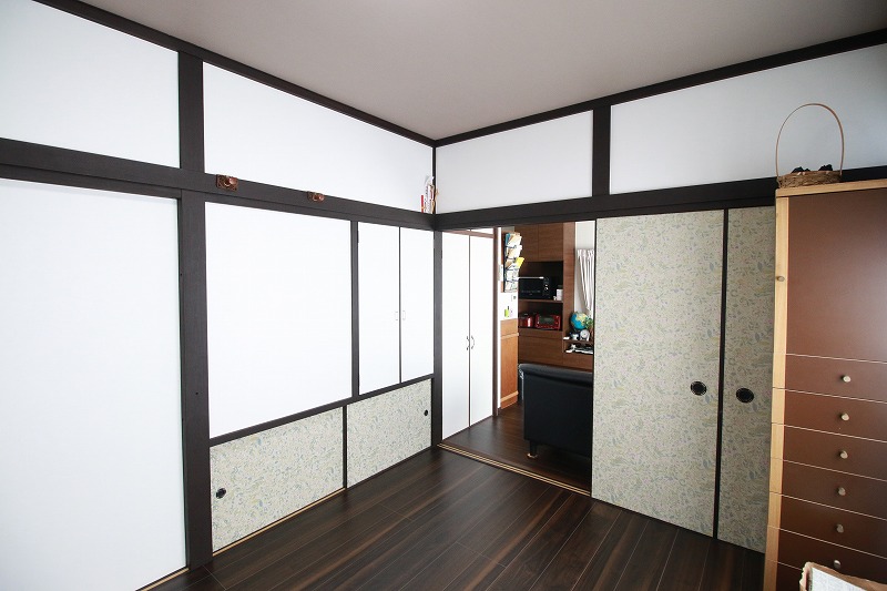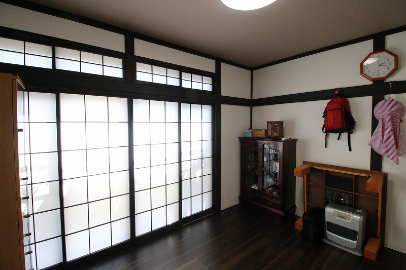 長押や柱、障子の枠などはそのまま活かし、落ち着いた色に塗り替えました。クロスや照明などの組み合わせで、和モダンテイストのステキな空間へ生まれ変わりました。