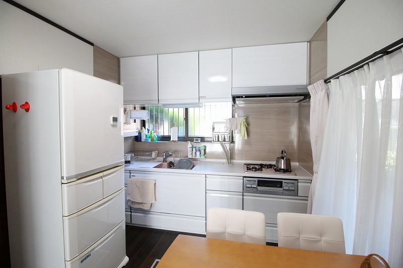 食器棚を取り払い、壁面に大型収納を新設することで、開放的でスッキリとした印象になりました。全体の大きさは同じですが、広く感じられます!