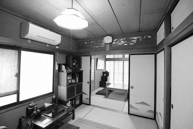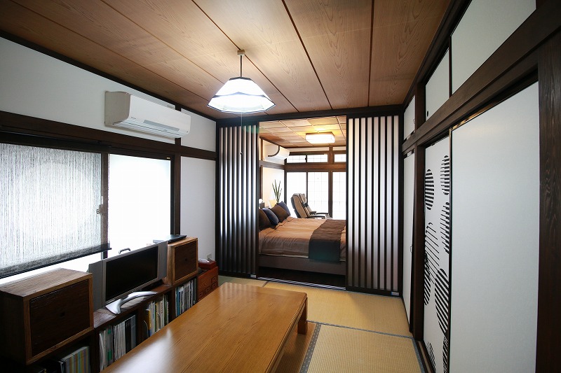続き間を仕切っていた襖を格子引き戸に変更。南からの陽の光がやさしく広がり 明るい空間へと変わりました。まっすぐに伸びる格子のラインが部屋全体をスッキリと見せます。