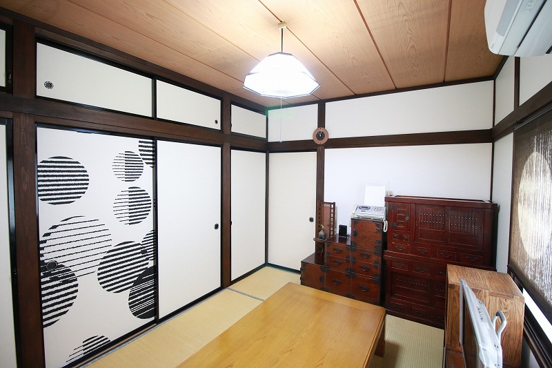 奥様がこだわりって厳選したモダンな襖紙。トラディショナルな格子戸と組み合わせることで、和の雰囲気の中にもスタイリッシュさが際立ちます。くつろぎの居間へと大変身!