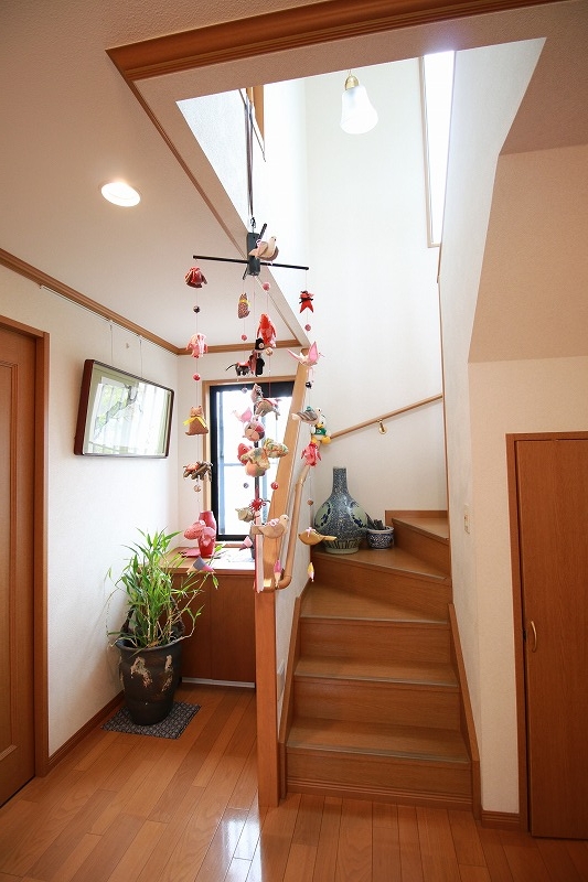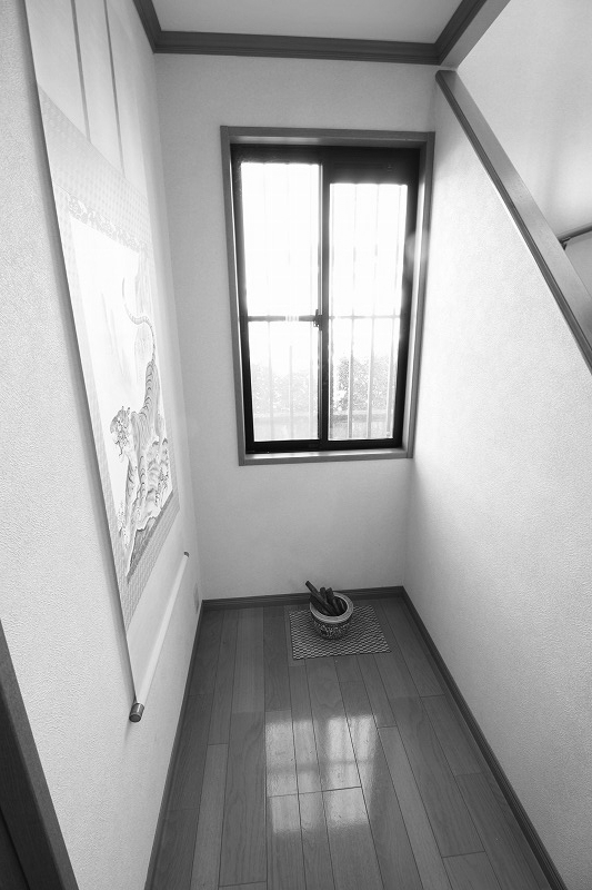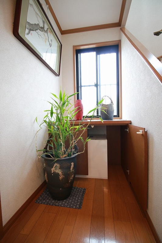 玄関に造作した飾り棚には、奥様が描かれた絵画や、お気に入りの小物が飾られていますが、実は中には蓄電池が収納されています。 無機質な蓄電池を隠しつつ、玄関を素敵に演出する工夫です。