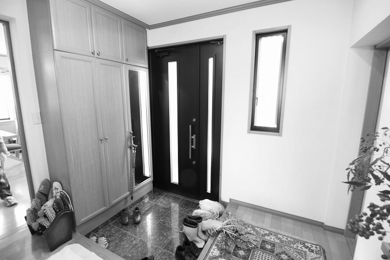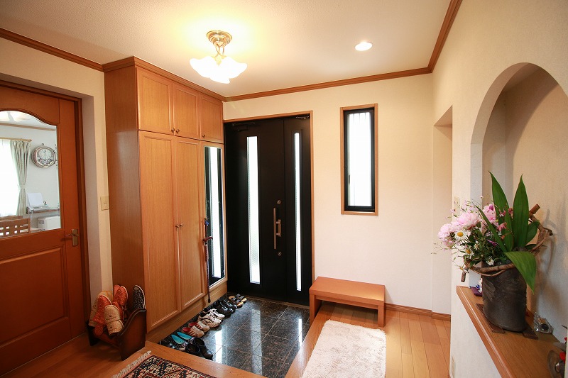 蓄電池収納を兼ねた飾り収納で玄関を演出します