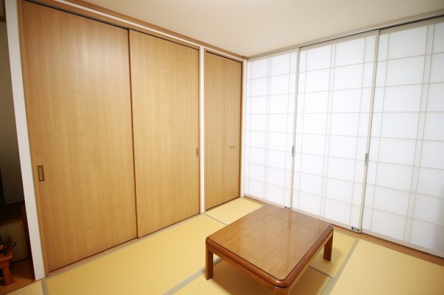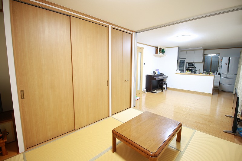 和室とリビングの壁をなくしつながりのある大空間へ。家族が大勢集まってもゆったりと過ごすことができます。また、独立した和室としても使えるように、光を通す間仕切りの扉を付けました。押入れはクローゼット収納に変えることで、洋服やお客様のコートなども仕舞えるようになりました。