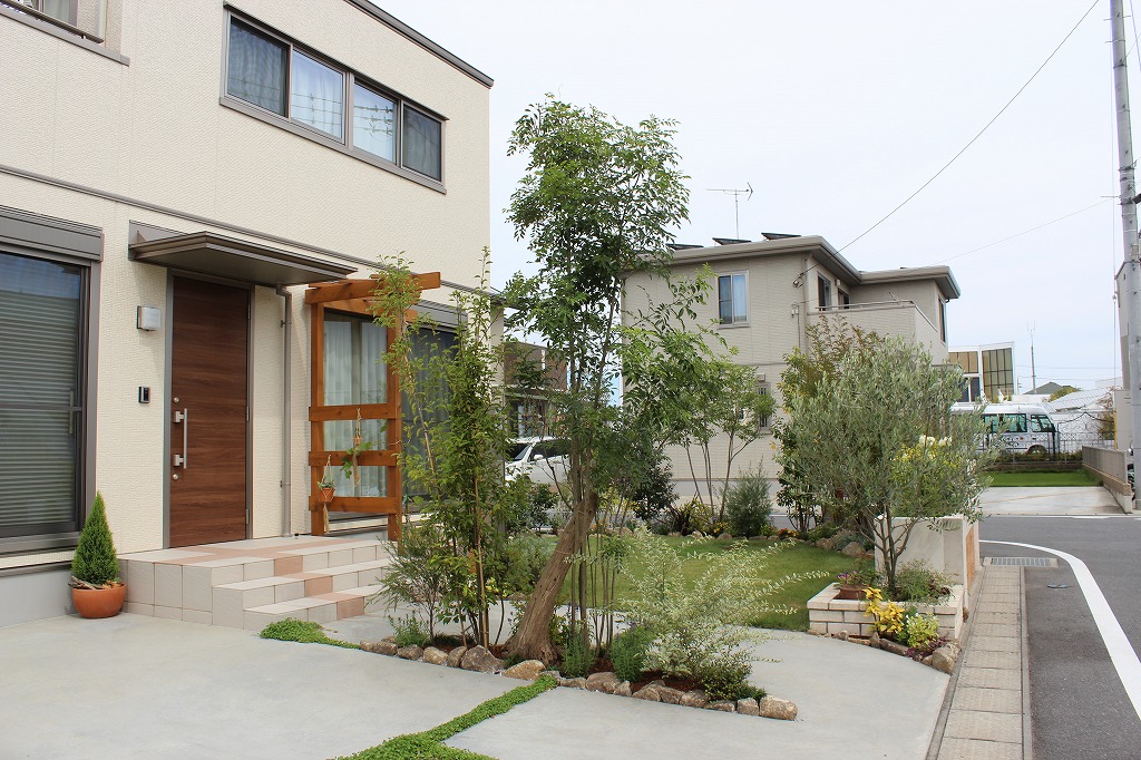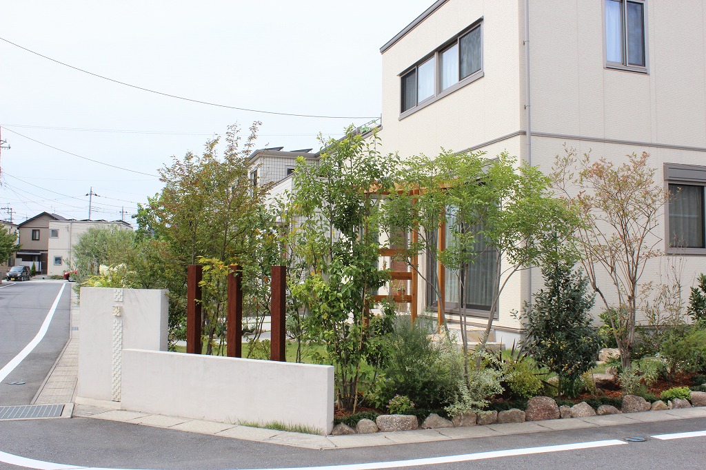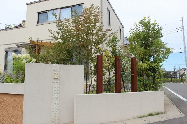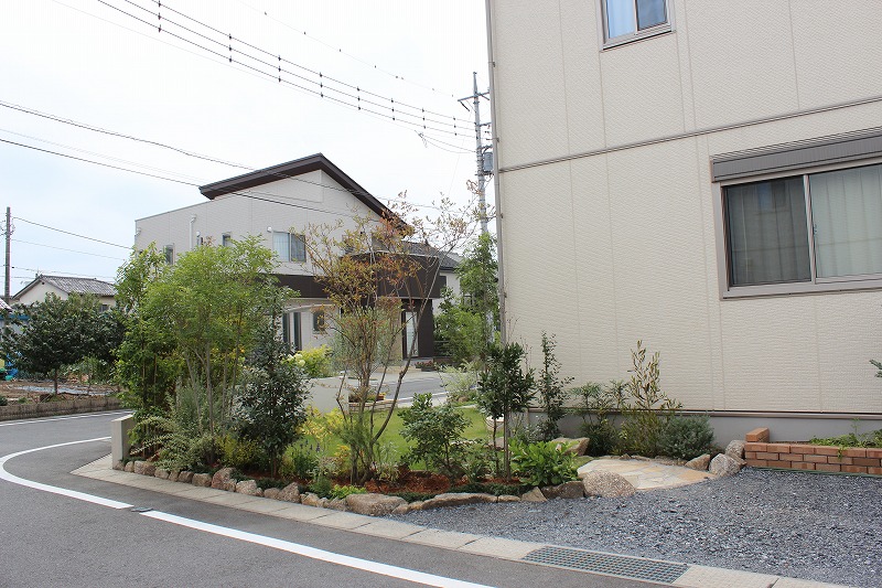 ブルーベリーやオレンジなどの実のなるものや、もみじやシャラなど季節を感じられる樹木を使用。通りからの目隠しとなるよう配置しました。
