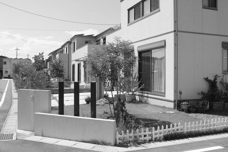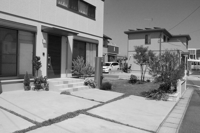 自然石でラインを区切り、植栽帯を設けることでプライベート空間を確保しました。