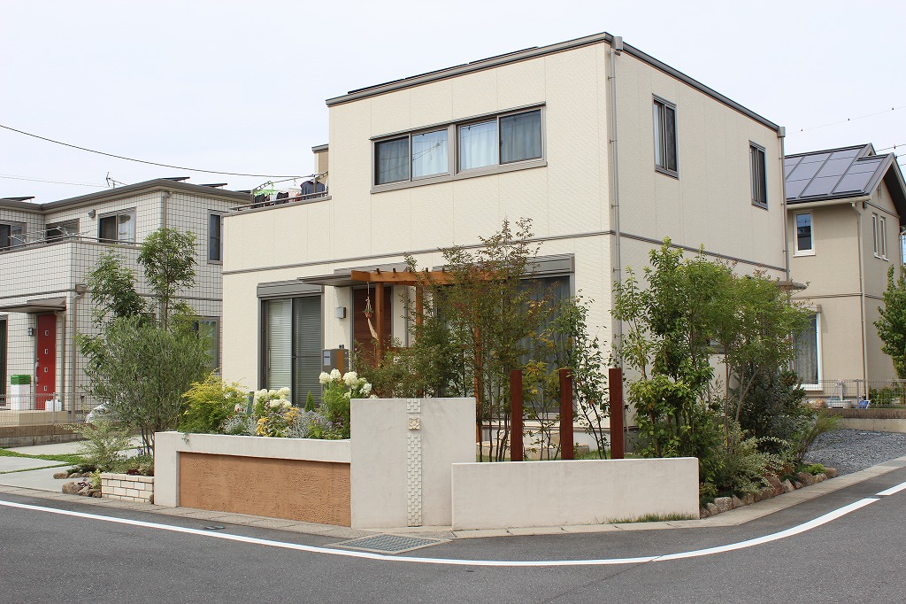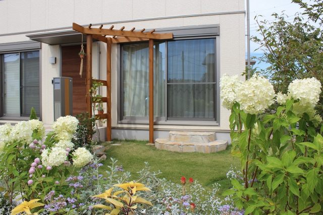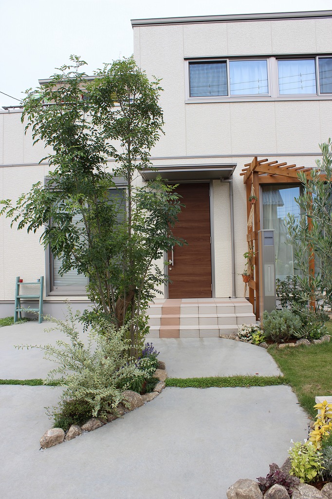 駐車スペースとアプローチの間に植栽帯をつくることで照り返しを防ぎます。つる性の植物を絡ませたいという奥様のご要望を受け、玄関脇にパーゴラを作りました。