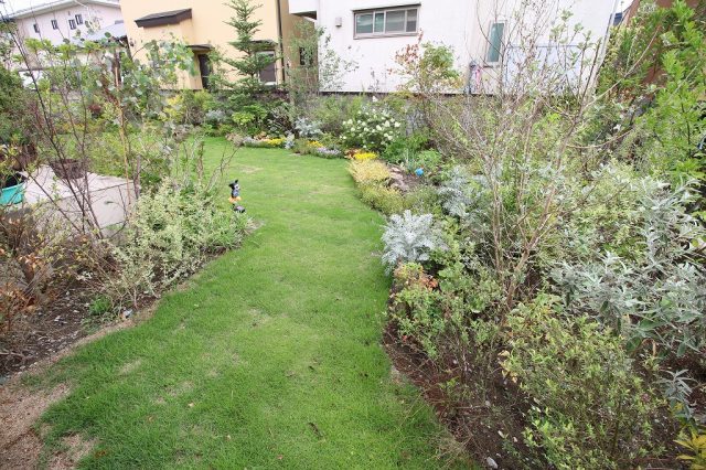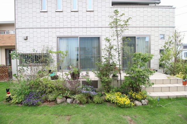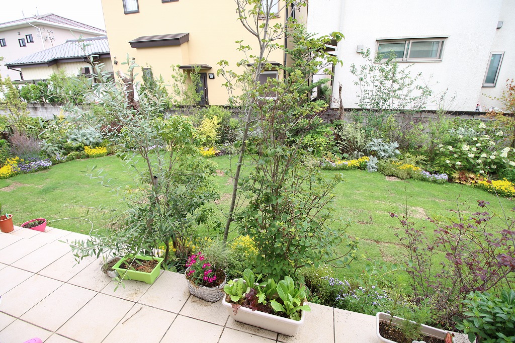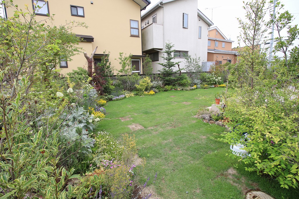 芝生敷きにすることで、お子様とワンちゃんが楽しく遊べるようになりました。また、樹木はなるべくたくさんの種類を植えました。そうすることで、複数種の虫がつき、例えばテントウムシがアブラムシを食べてくれるなど、緑の力で自然にメンテナンスできます。