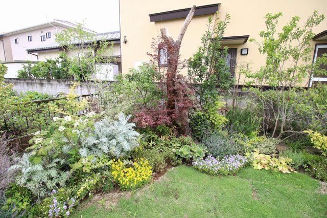 お庭周りを緑で囲い森をイメージしました。石原流のお庭デザインは、植栽だけでなく流木を組み合わせた取り合いが特徴です。見た目のインパクトはもちろん、隣家の窓側に配置することで目隠しの役割も果たします。