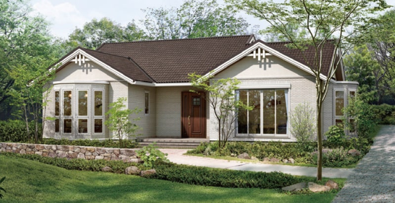 ホワイトを基調に、全体を明るいトーンでまとめたスタイル。切妻屋根の上部に設けた「矢切飾り」がカントリーな雰囲気を演出します。