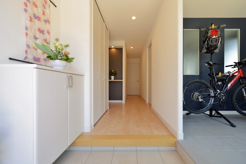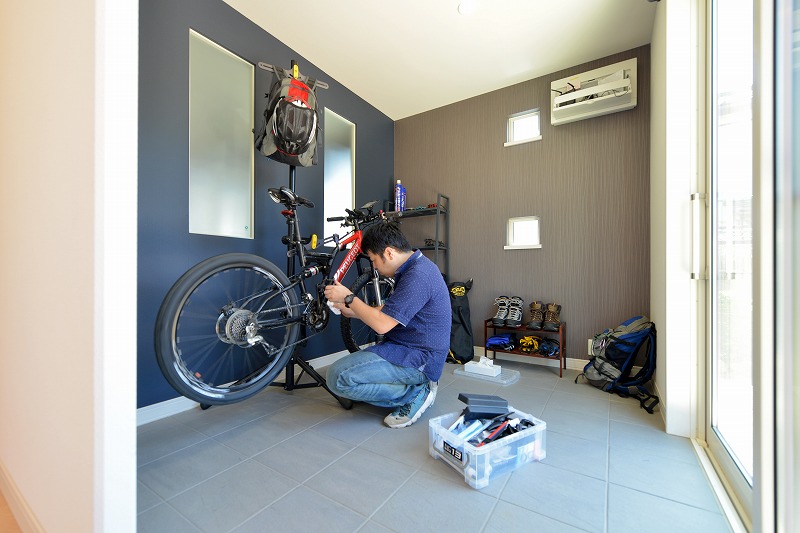 玄関土間スペースを利用した部屋は、趣味の自転車やアウトドアグッズなどを収納するスペースになっており