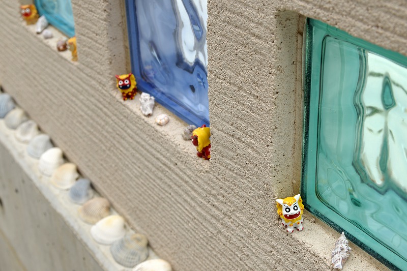 沖縄の守護神シーサー。琉球ガラスの表札。海をイメージした水色のガラスブロック。